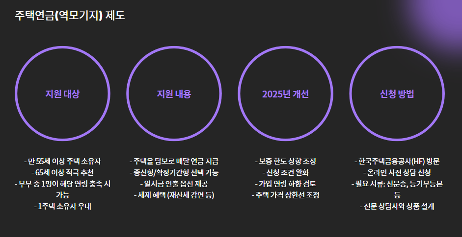 - 지원 내용: 주택을 담보로 매달 연금처럼 현금 지급