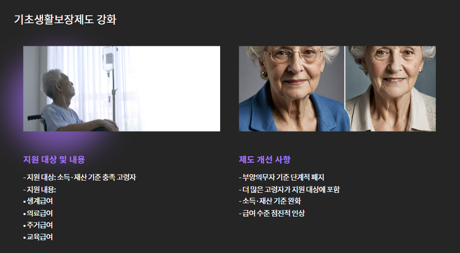 - 특징: 부양의무자 기준 단계적 폐지로 더 많은 고령자가 지원 대상 포함