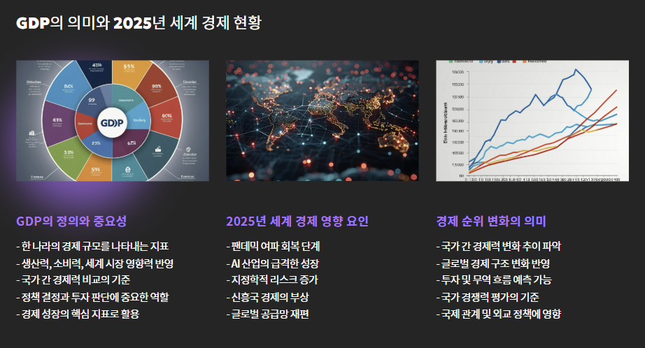 2025년 현재, 세계 경제는 팬데믹 여파 회복, AI 산업 성장, 지정학적 리스크 등 다양한 변수 속에서 경제 순위에 적지 않은 변화를 가져왔습니다.