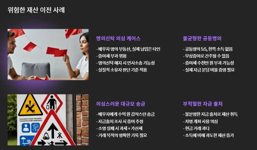 - 배우자 명의로 부동산 등기 → 실제 대금은 상대방 계좌에서 이체