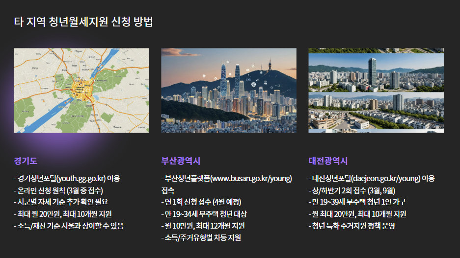 서울시는 물론, 경기, 부산, 대전 등 여러 지자체에서 각각 운영 중이며, 국토교통부에서도 국가 차원의 월세 지원 사업을 시행하고 있습니다.